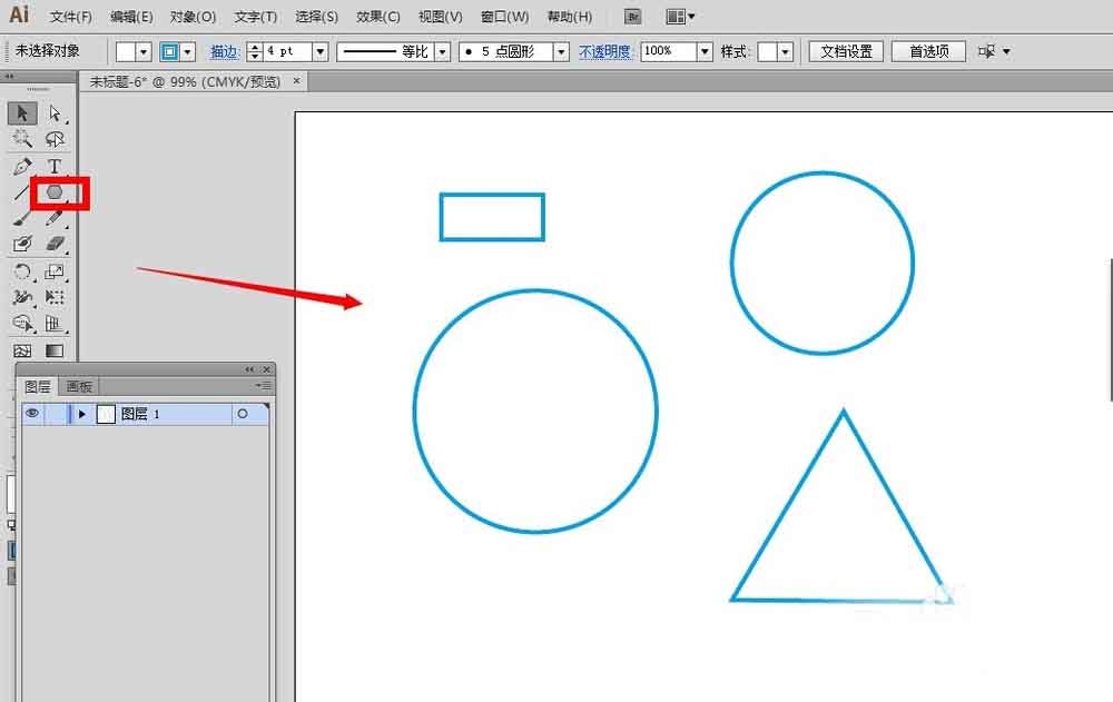 1、在新建的画布上分别绘制一个大正圆、小正圆、矩形、三角形,总共四个图形