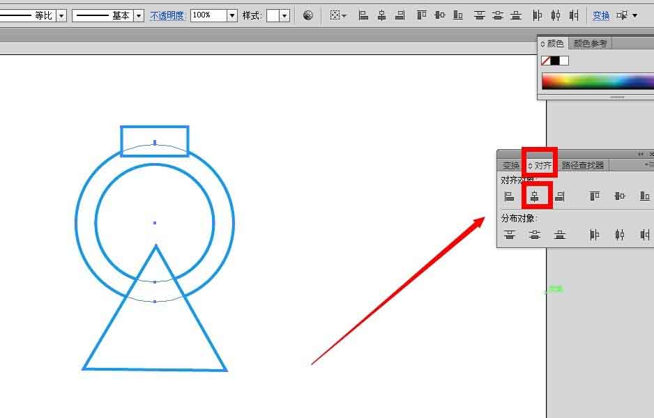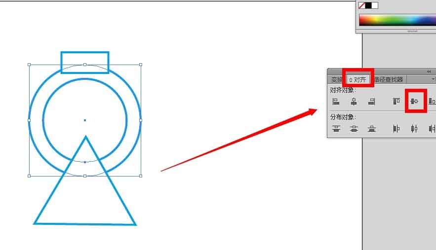 3、选中全部图形,在对齐的面板中,点击第二种“水平居中对齐”