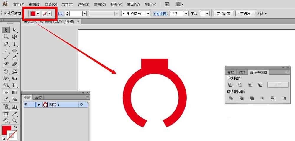 5、接着点击选中大圆,按住键盘的alt键,点击路径查找器面板的第一种形状模式“联集”
