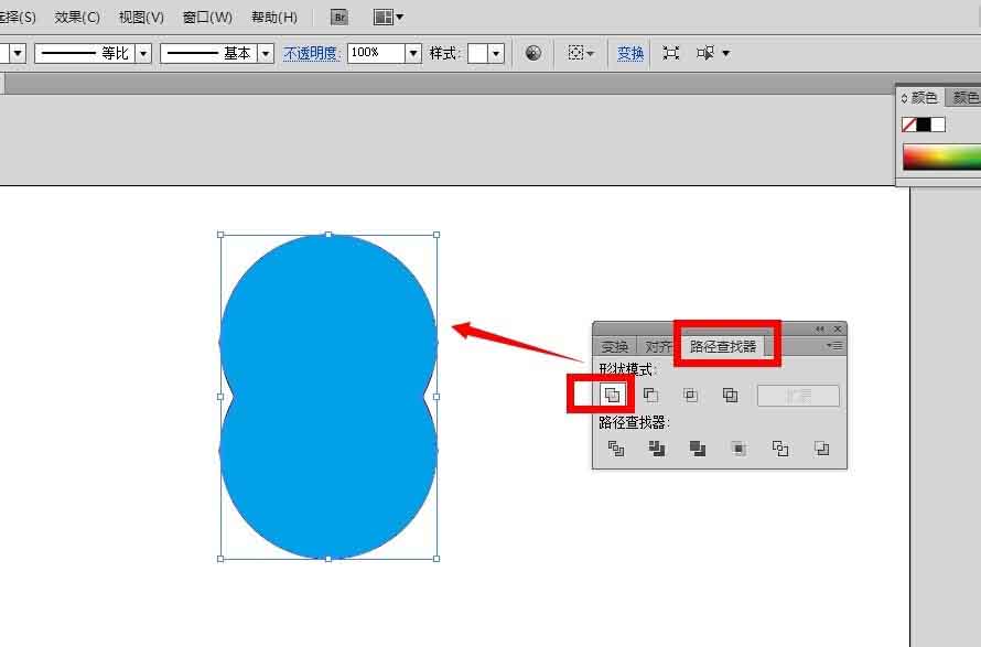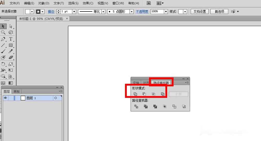 2、有些人的ai软件刚打开,路径查找器不一定就会默认在软件上面,先把路径查找器调出来,然后就会看到路径查找器面板下有四种形状模式