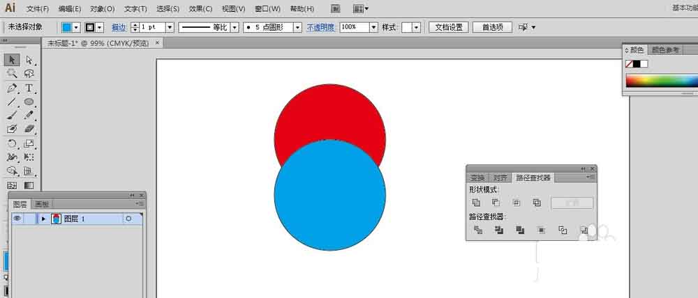 3、为了形状感受到四种形状模式的不同,现在先在画布上画出两个圆,一个填充为红色,一个填充为蓝色