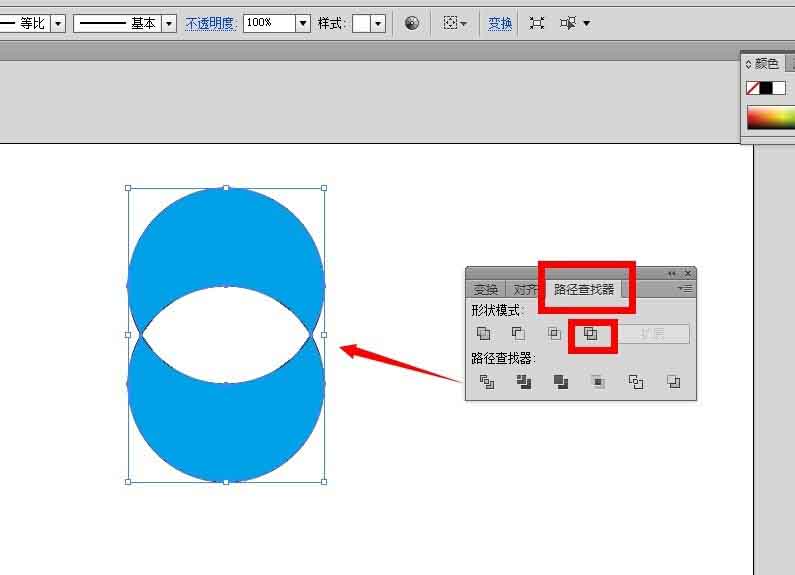 6、全部选中两个圆,点击下形状模式的第三种方式,会得到两个圆相交的部分,这个就是交集~