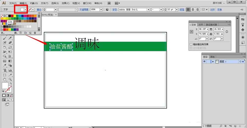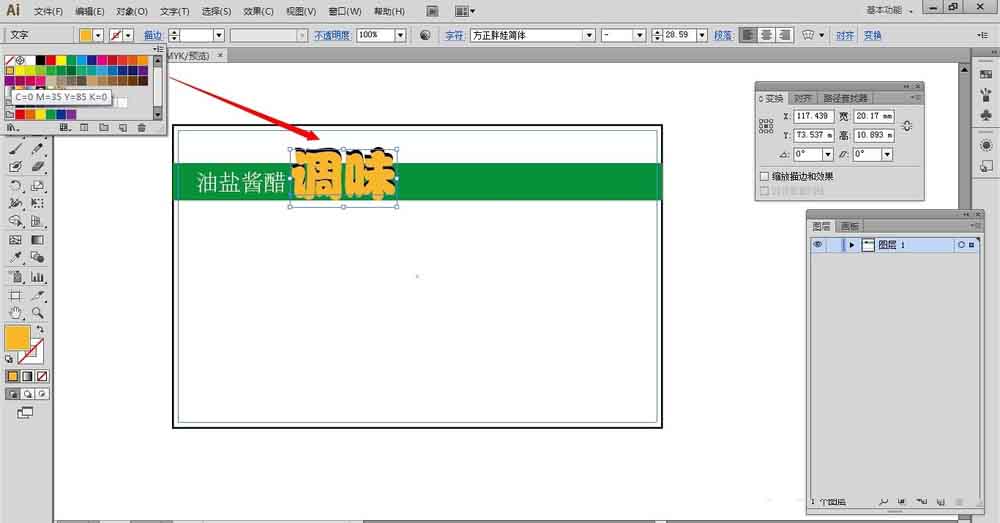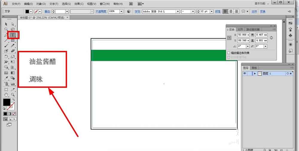 3、接着,把两个文字内容分别移动到绿色矩形的合适位置上,并且适当调节字距,大小,把“油盐酱醋”改成白色