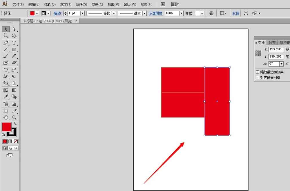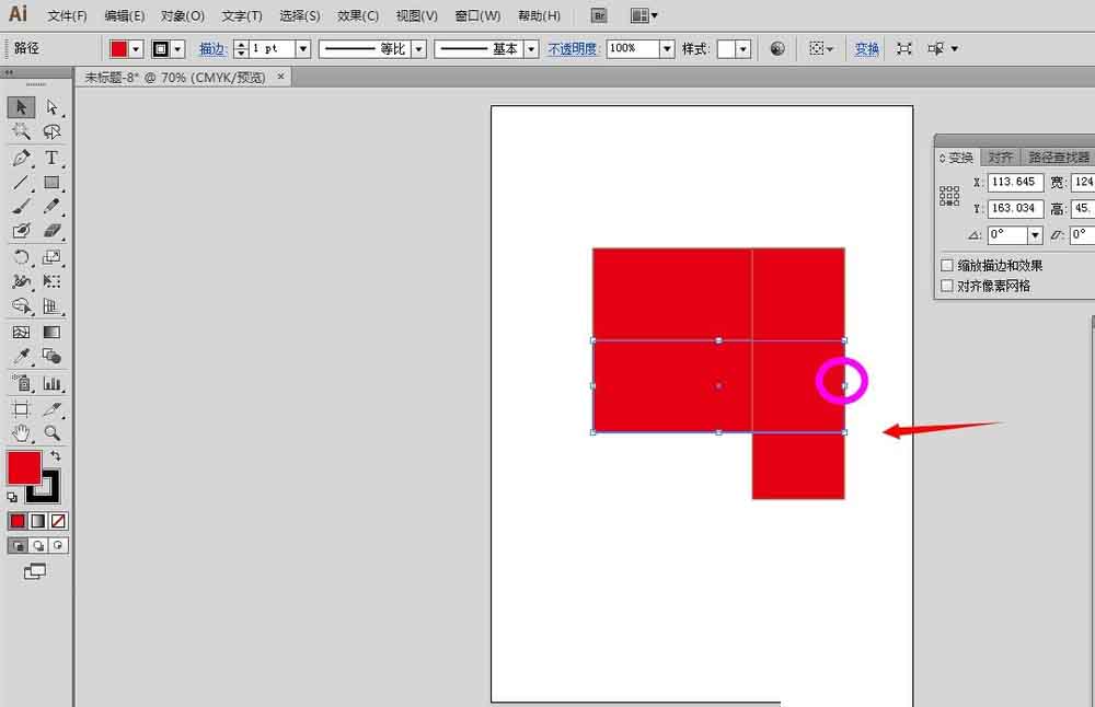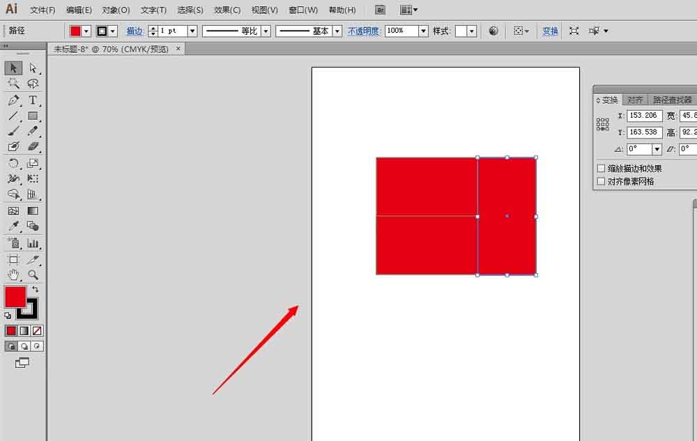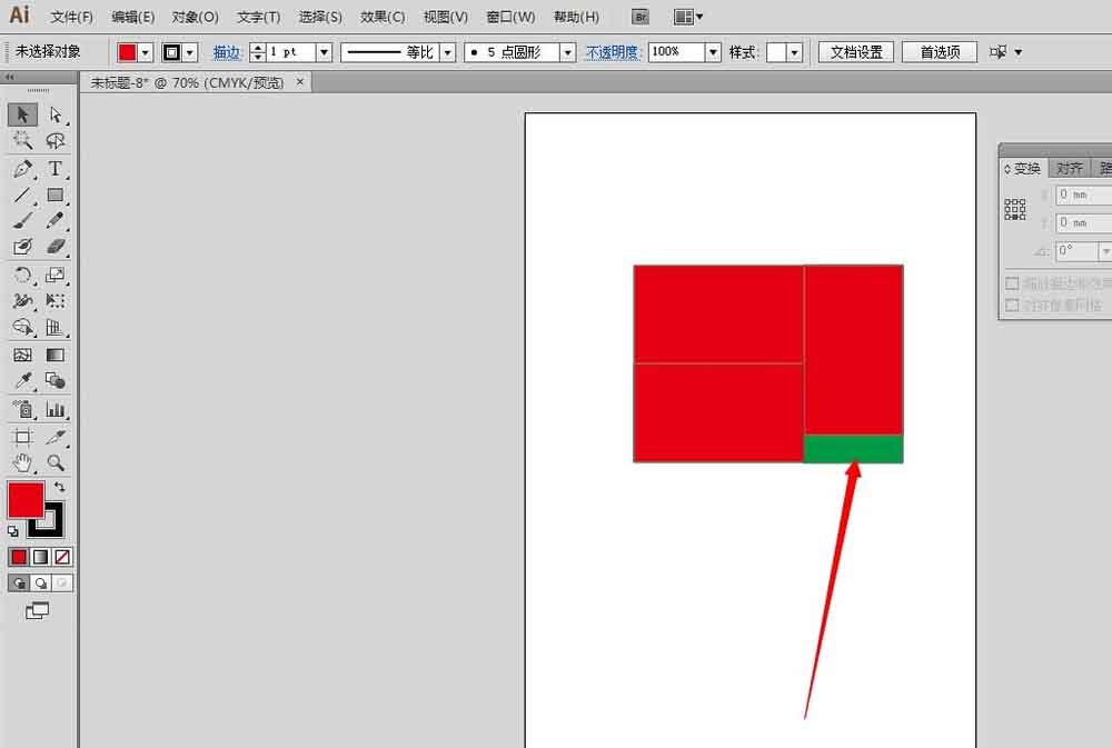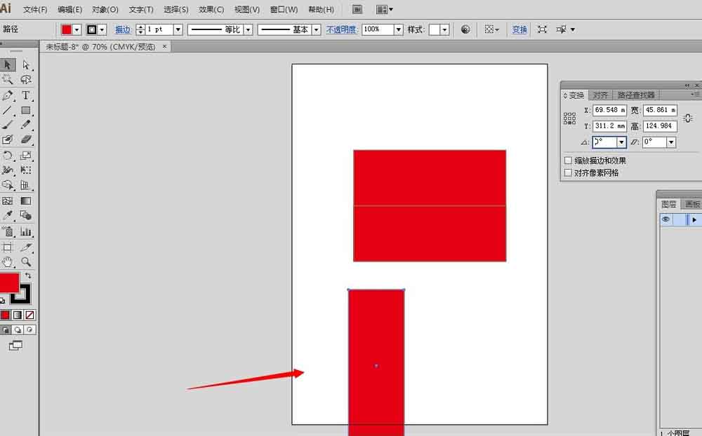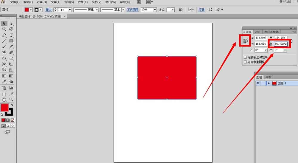 2、选中红色矩形,在变换面板里面,设置参考点为下中,高度除以2,