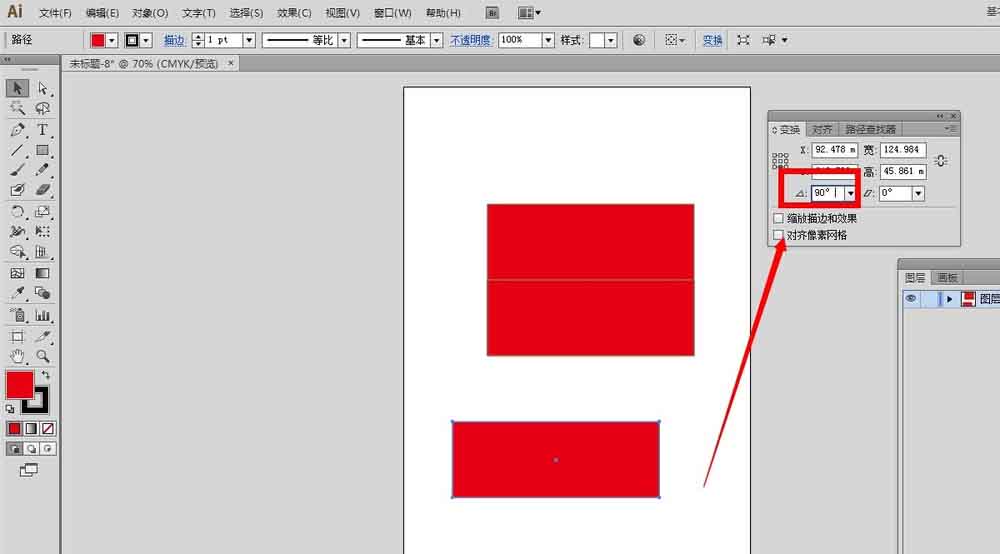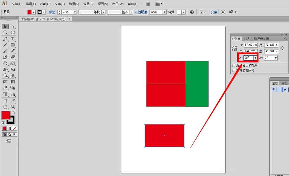 10、选中复制出来的红色小矩形,在变换面板里设置旋转角度为90°