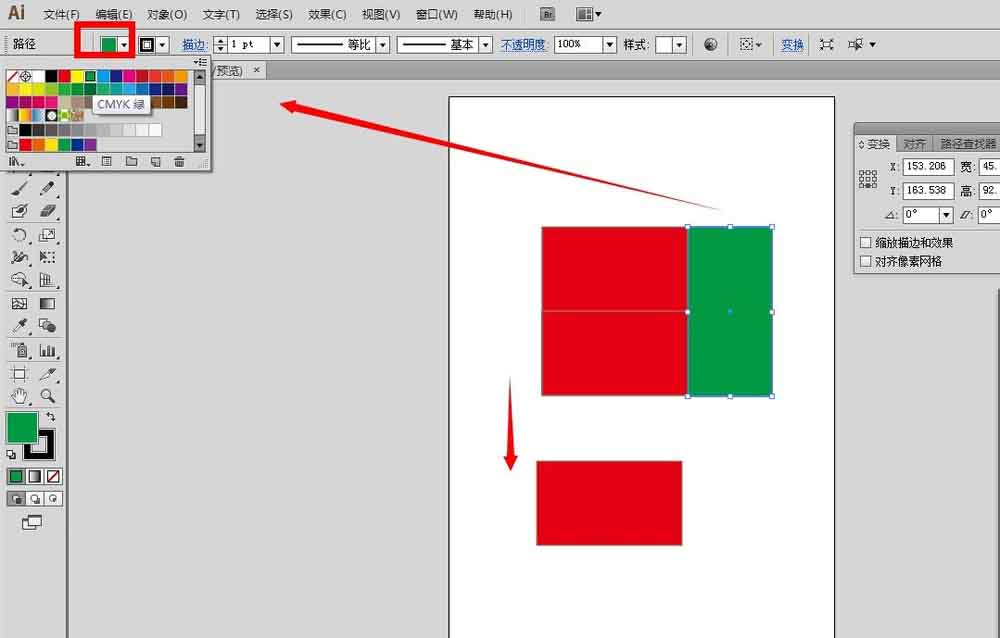 9、选中坐下的矩形,按住alt键,往下复制出一个矩形,并且把右边的矩形填充为区别于红色的其他的颜色,比如绿色