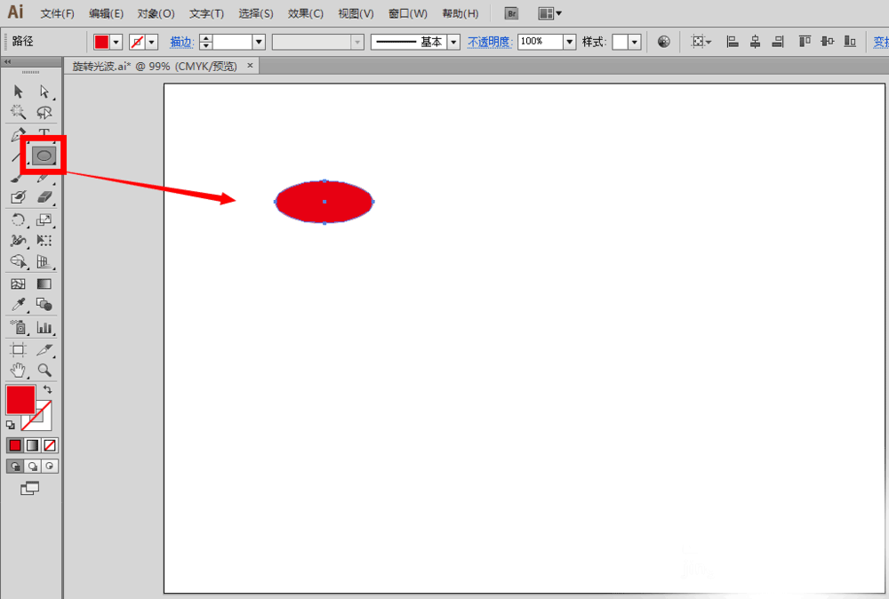 1、使用椭圆工具,在画布上绘制一个红色的椭圆形