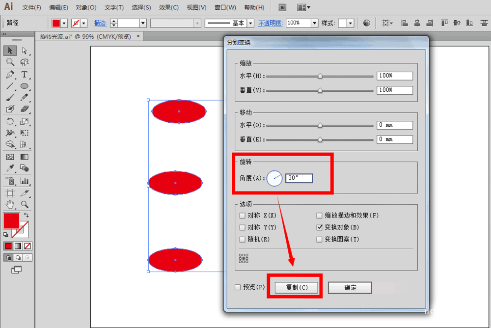 5、在弹出来的分别变换面板里设置旋转角度为30°,点击复制按钮