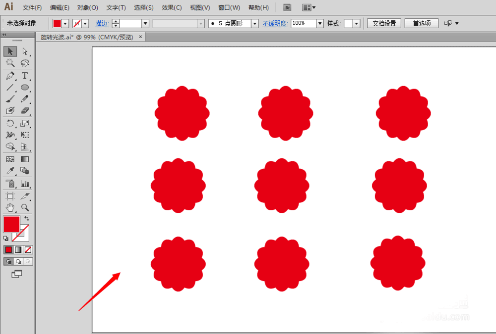 7、接着,我们连续按键盘上的ctrl+D键六次,大概可以得到了画布上这样比较特别的九个红色花瓣