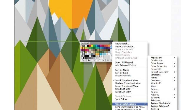 3、选择调色板。选择一个合适的颜色调色板 - 我已经走了的东西有机和已经使用的语气开始添加深度。插画师在斯沃琪飞出菜单一些非常好的预先确定的调色板(选择打开色板库)。