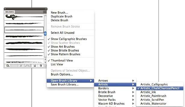 4、添加纹理形状。现在,让我们添加纹理到我们的扁平形状的边缘,给他们一个轻微的手绘感觉。打开画笔面板中,选择下拉菜单,去打开画笔库>艺术> 粉笔炭笔。