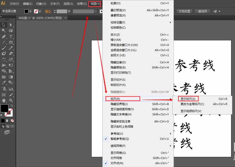 2、第一个拉参考线 首先打开标尺工具 如图 点击 视图-标尺-显示标尺(快捷键 Ctrl+R)