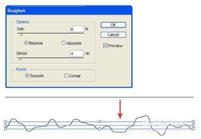 7、扭曲和转换(效果>扭曲&变换>变粗糙)。变粗糙,曲折,有一些方便的工具下扭曲快速使波或粗加工边缘。 你可以做造纸的眼泪,海浪和地形。 下面是一个例子我可以仅仅通过粗化山的轮廓线。