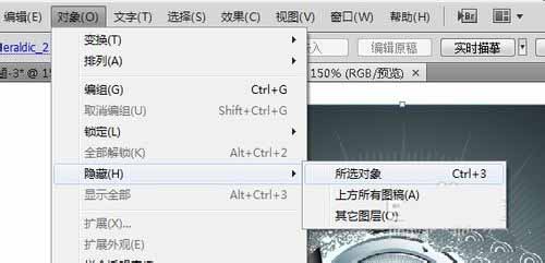 4、之后我们在打开对象菜单栏,找到里面的隐藏选项再选择里面的所选对象或者是快捷键Ctrl+3