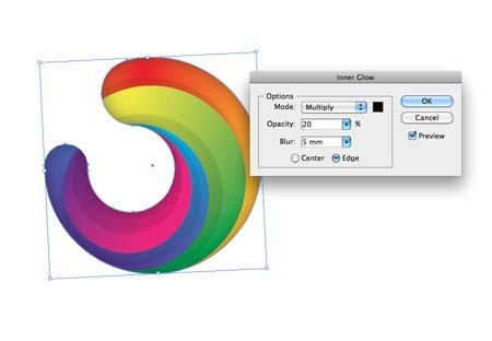17、赋予形状的白色填充,并将其设置为正片叠底,然后去影响>风格化>内发光。更改设置为正片叠底,黑色,20%的不透明度和5mm模糊。