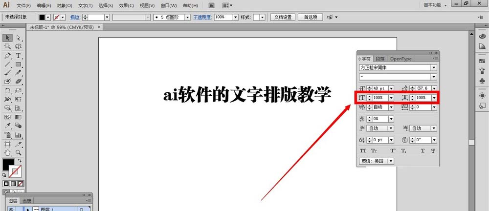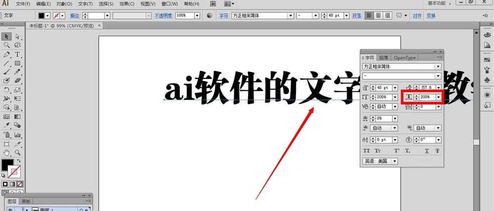 4、同样地,如果我们还想要设置文字的水平缩放,选中文字,打开水平缩放的小三角形箭头