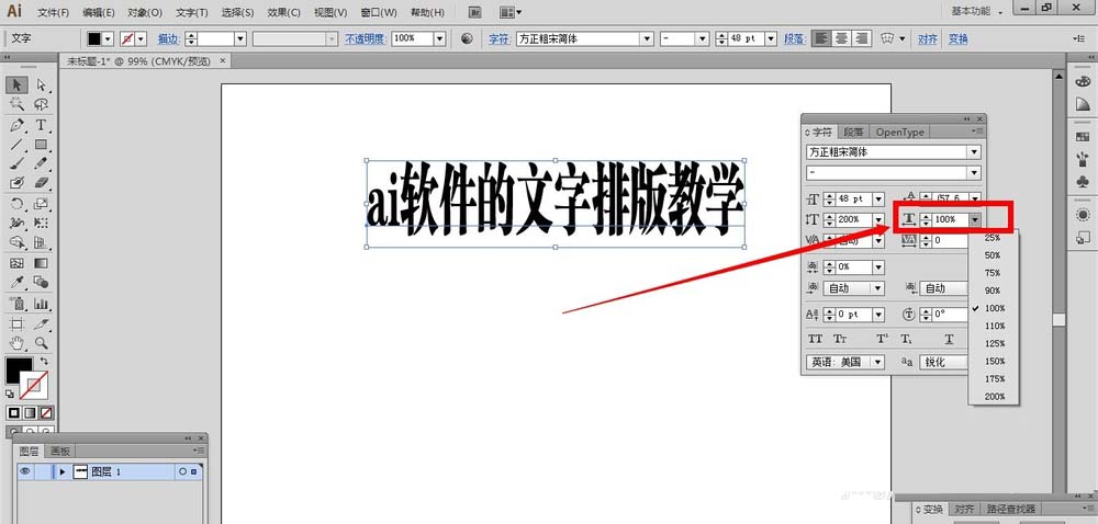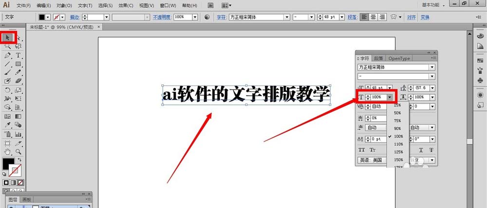 2、假如我们要把全部的文字内容垂直缩放,那么就使用选择工具,全部选中文字,点开垂直缩放旁边的小三角形箭头,会看到里面有很多的比例数字