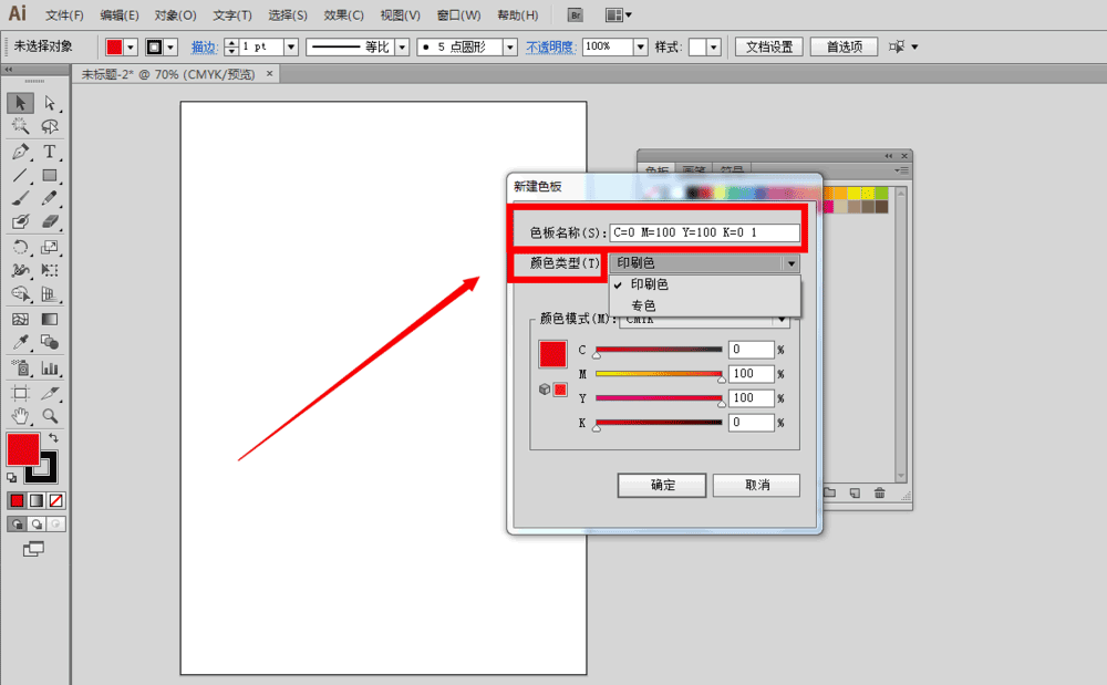 3、第一栏是色板名称,可以自己为自己的颜色曲取一个特定的名称;第二栏是颜色类型,可以选择印刷色或者专色