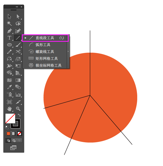 3.选择工具箱中的“直线段工具”,从圆形中心点绘制出几条直线,这些直线将是ai饼状图的饼图部分。