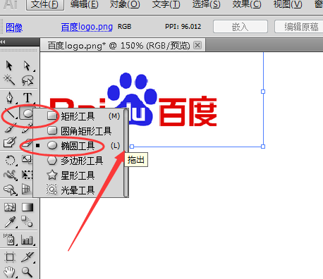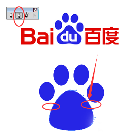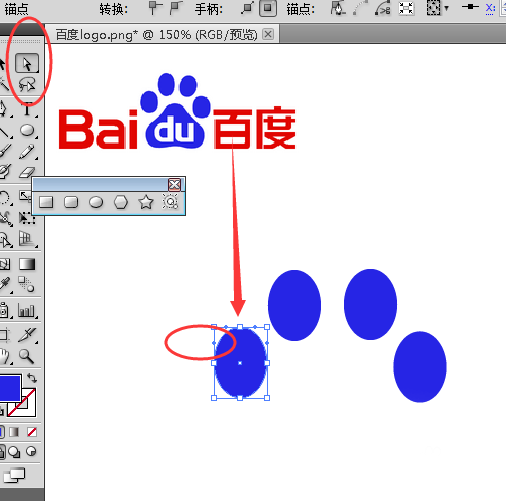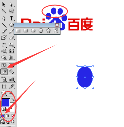 3、然后我们开始绘制百度logo中最复杂的部分——猫爪,先选择旁边工具栏中的椭圆工具在画板上画四个椭圆,并使用吸管工具填色,