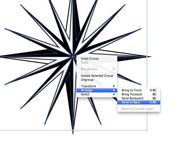 7、集成的两个对象的元素结合在一起,然后将它们对齐集中。使用快捷键CMD + Shift + [或用鼠标右键单击排列菜单到16点的星形发送到堆栈的后面。