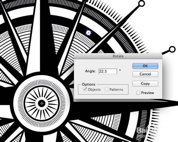 21、要创建均匀分布的元素周围的设计选择旋转工具,按住Alt键并调整支点的设计中心。在选项框计算角度除以元件的数目由360°,所以16个元素= 22.5。打副本创建的第一个副本,然后按CMD + D效果的重复。