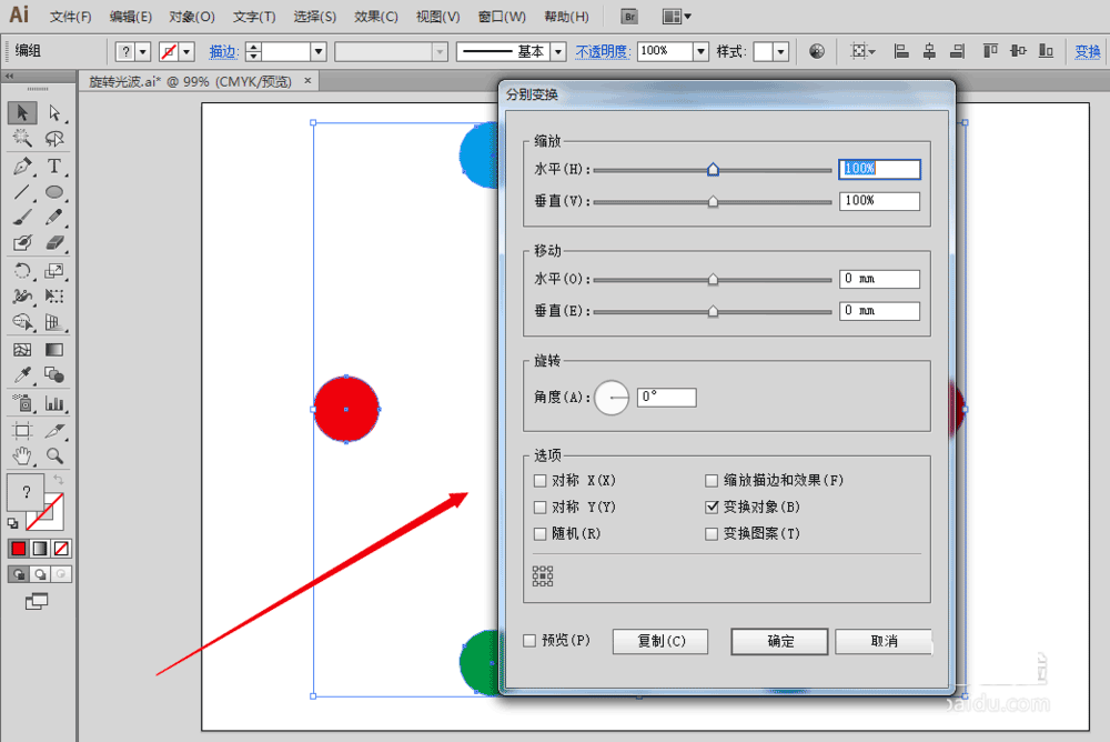 1、我们以前面的例子来说明,六个正圆编组以后,点击菜单栏的对象——变换——分别变换按钮