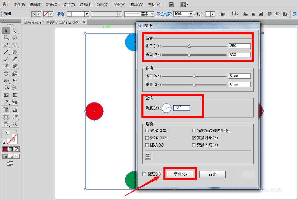 3、我们把水平和垂直的缩放比例同时设置为85%,旋转角度设置为13°,设置完以后,点击复制按钮