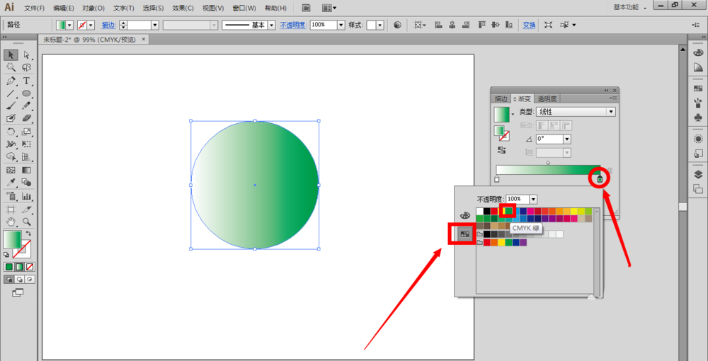 2、双击渐变色板上的渐变滑块上的光标,在弹出来的面板上单击色板,比如我选择了绿色,也可以适当调整光标,来调整渐变颜色