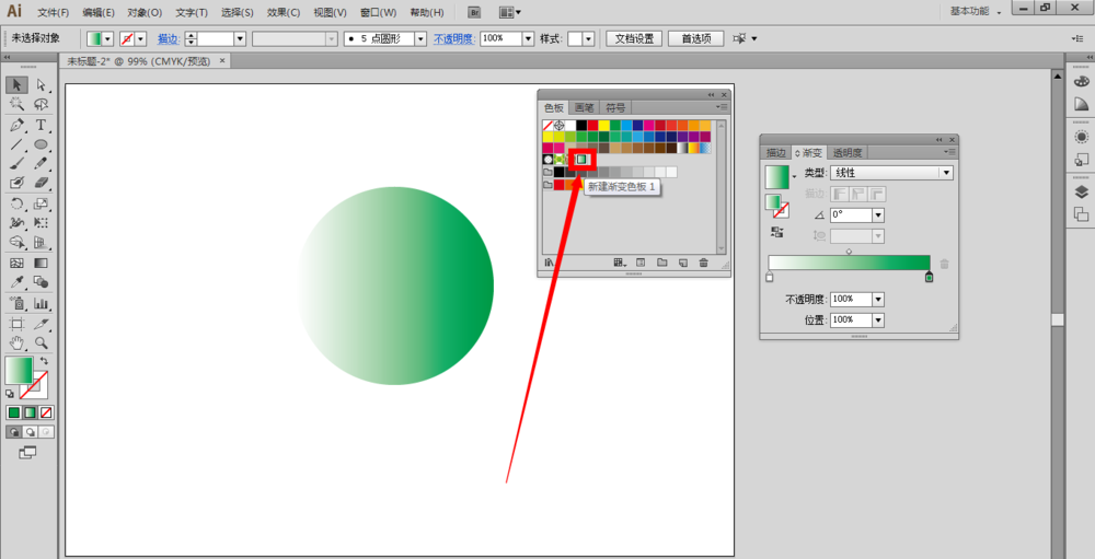 7、在色板面板上我们也可以看到,我们自己新建的渐变色板同时也出现在色板上了。