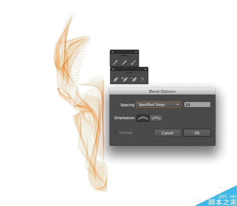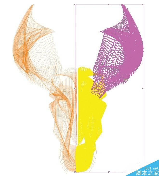 4、选择您的鹿的脸的所有行(不带角)。转到对象>混合后产生的中间轮廓,让绘图的深度。选择你想要的行数,最好的办法是通过试验和错误。我用20头,保证间距设置为指定的步骤。做同样的事情为你的第一套喇叭。我用了30步,因为在这里我的画线少,所以我结束了被混合在脸上创建的行大致相同的密度。与其他组喇叭重复此。保存为deer-complete.ai。挑选你最喜欢的角和删除等。保存为deer-horns1.ai。现在我们的艺术品正在形成。