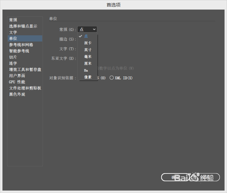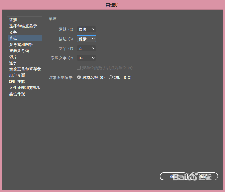 4、在AI中,在菜单栏编辑——首选项——单位中可以更改新建文件中的默认对象单位。