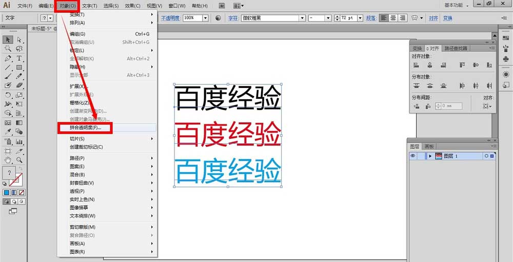 5、接着,用选择工具,全选文字,点击菜单栏的“对象”——“拼合透明度”