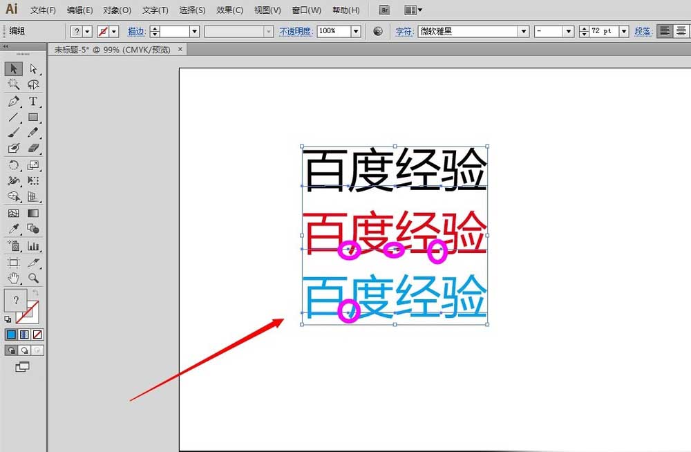 9、最后,我们使用白色箭头“直接选择工具”,选中每个字移动即可。画布上的文字都被打散成为单独的一个个文字了。