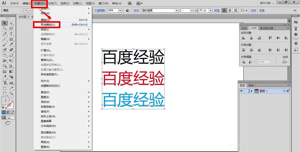 8、我们接着用鼠标点击“对象”——“取消编组”