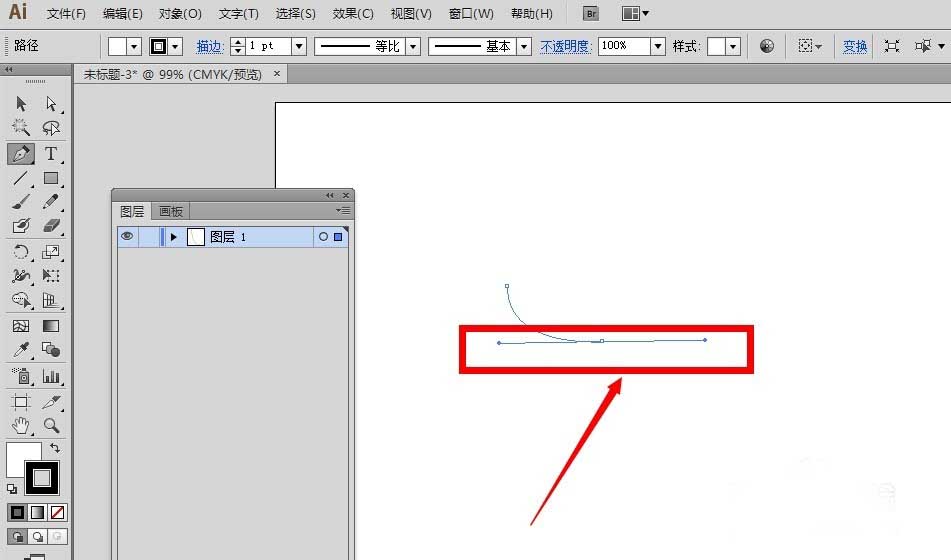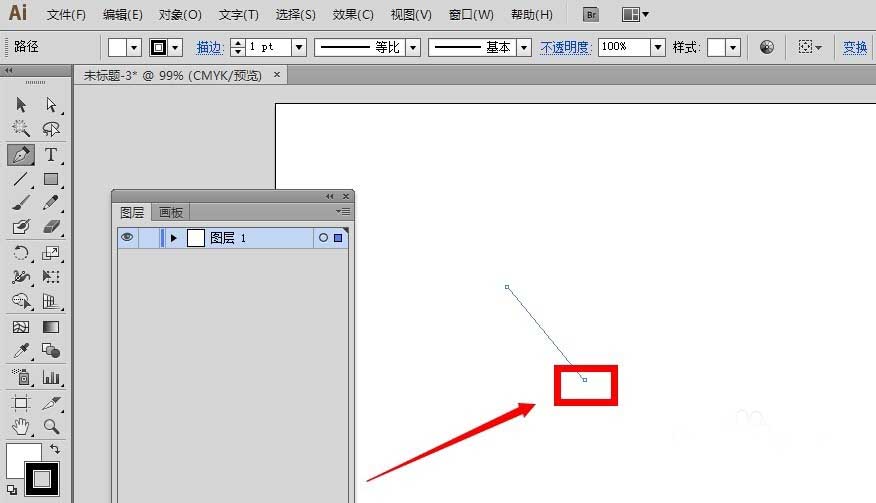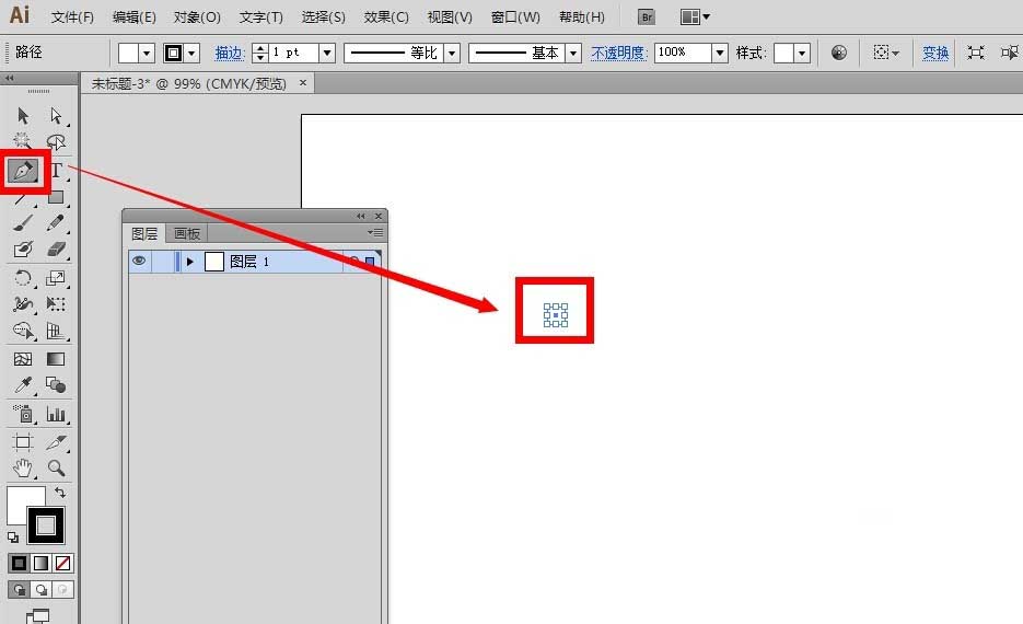 1、选择钢笔工具,在画布的空白处,轻轻单击一下,画布上就会现出一个点