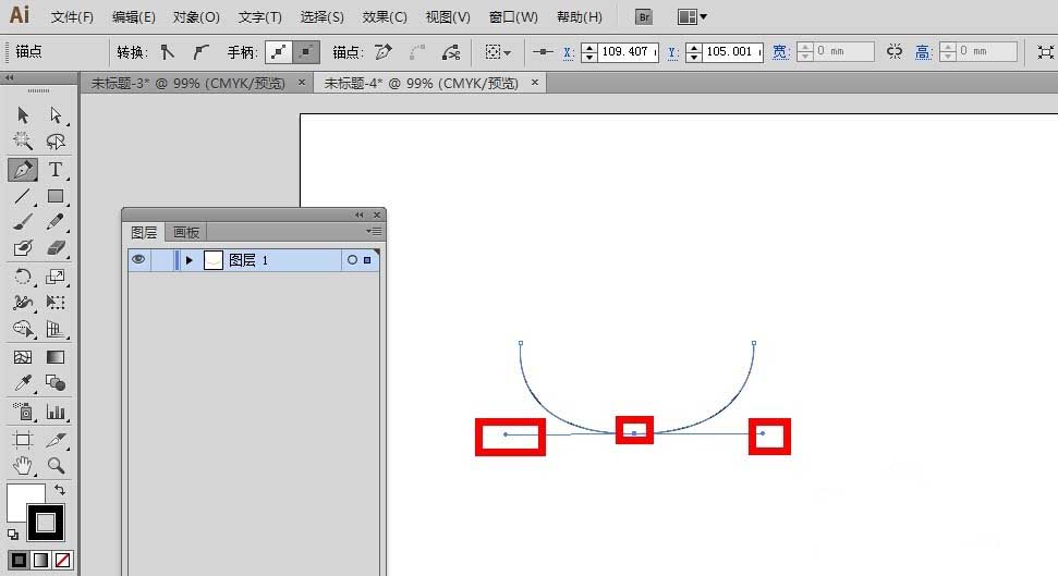 6、框完以后,会发现,双弧形底下的直线有三个点,有人可以叫控制键,也有人叫方向键