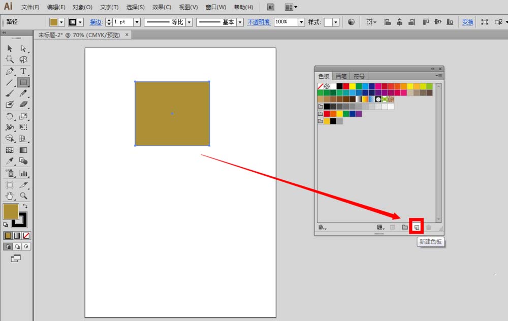 1、如果需要把画布上的矩形的颜色添加到色板上的话,我们只需要点击色板底端的”新建色板“按钮即可