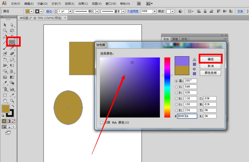 2、假使我们现在使用椭圆工具,在画布上绘制一个椭圆形,并且赋予色板上没有的颜色,点击确定按钮