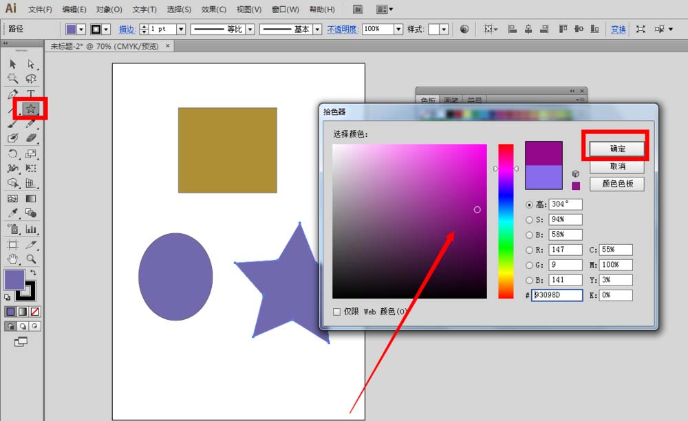 3、接着,再使用星形工具绘制第三个图形五角星,同样赋予色板上没有的颜色,点击确定按钮