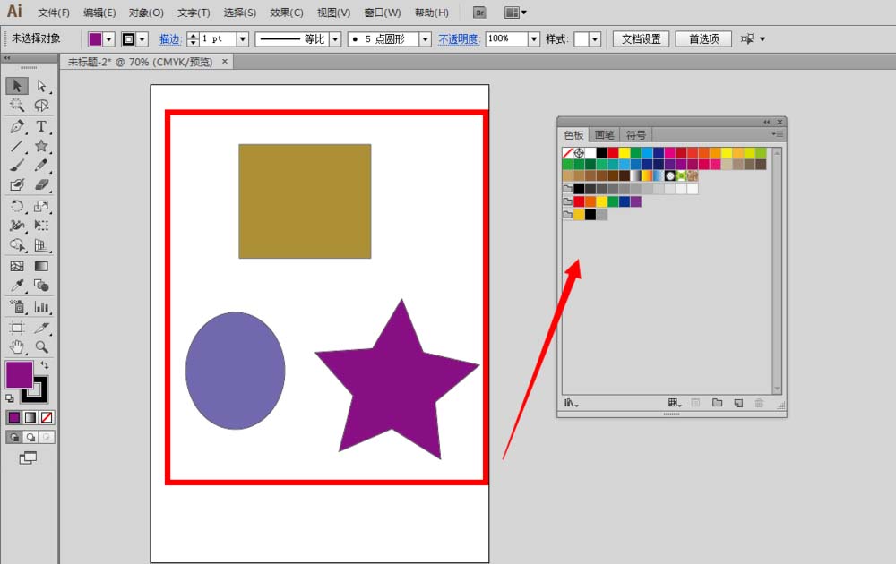 4、现在画布上已经有三个图形或者甚至当我们有很多个图形很多种颜色的时候,想要把它们都添加到色板上,如何操作?