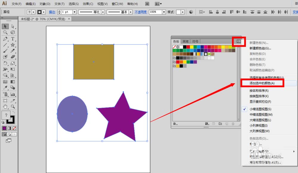 5、同时选中画布上想要添加到色板的图形,然后用鼠标点击色板右边的菜单栏,在下拉面板里面选择”添加选中的颜色“