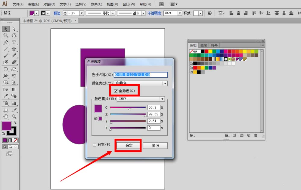 8、或者我们双击色板里面的某一种全局色,在弹出来的面板里面去掉全局色前面的打勾,点击确定按钮,也可以把这种全局色变成普通的色板。