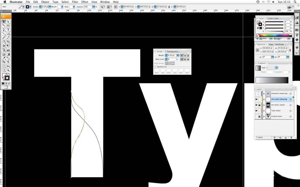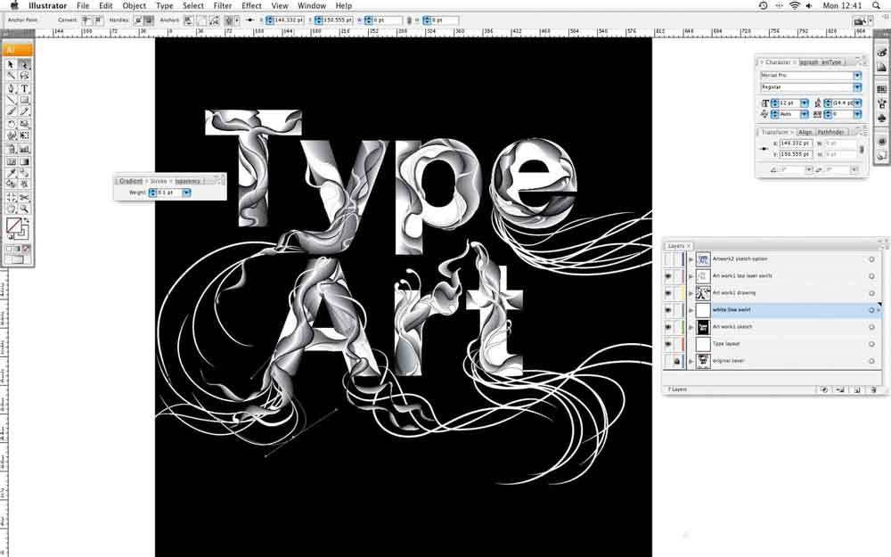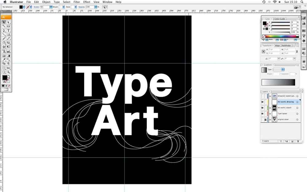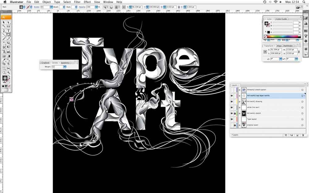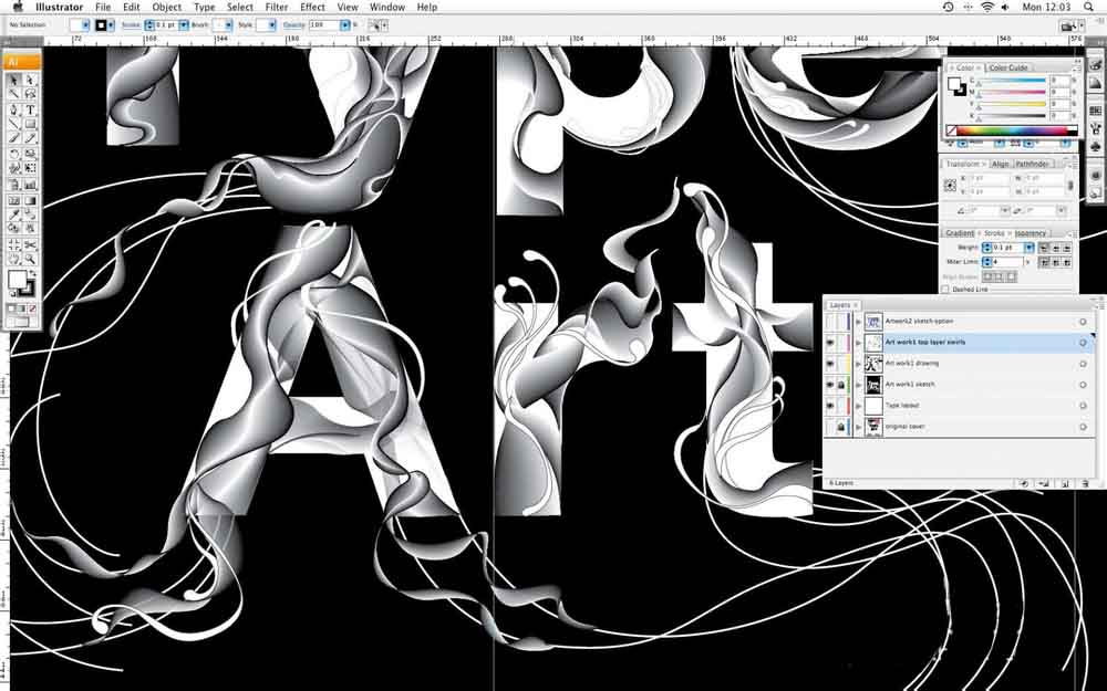 1、在Illustrator中,打开一个新的文件,并成立了一个A4艺术品。键入黑体写着“艺术类”,然后创建一个轮廓(类型>创建轮廓,或命令/按Ctrl + Shift + O)。做任何调整,以你的类型使用直接选择工具(白色箭头),然后用钢笔工具(P)创建的漩涡,你想该行流动。这些不需要是精确的-你可以在以后对其进行调整。当您完成后,锁定这一层,所以你不能移动它-你只用它作为指导