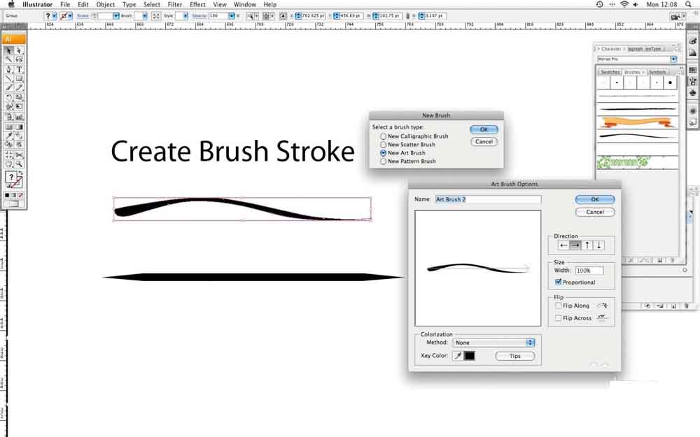 7、现在,我们需要创建一个刷子。我们需要一个中风的薄在开头和结尾:你可以从你的教程开始打开的项目文件打开文件material.ai每个笔刷形状复制到您的文件-或者创建一个行自己的,然后点击画笔标志,并选择新画笔>新艺术画笔>比例。