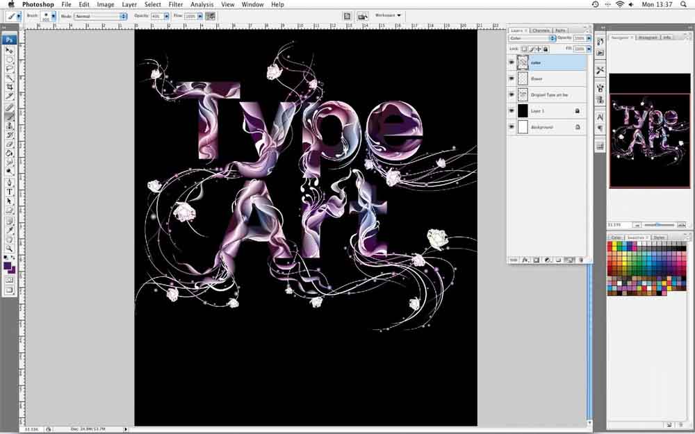 9、一旦你把一切都在正确的地方,是时候为装饰工艺。您可以添加使用椭圆工具(圈子L)与径向渐变色。玩弄这些,让他们稍微大信附近,较小的渐行渐远,并把周围的白色漩涡线。解锁你的艺术类型的文字字母,并设置字母色彩到50%的灰色。然后复制图层