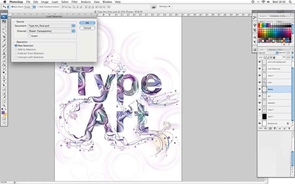 14、删除黑色背景层。点击白色旋涡状线层上,然后反其(命令/按Ctrl + I):这将成为一条黑线。设置图层的不透明度为50%和移动它,所以它的颜色层下-这会给艺术品美丽柔和的色彩。现在,您可以将颜色的玫瑰,如果你还没有做他们早已:点击花层,选择>载入选区,然后创建另一个图层,将其设置为正片叠底。开始填写玫瑰在层颜色