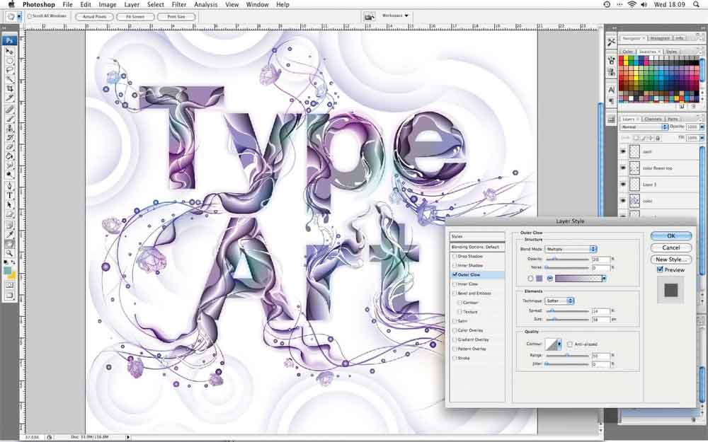 15、现在,我们需要添加最后的润色-我想的话焕发; 这也使得它们更容易阅读。点击你从Illustrator中,选择粘贴你原来的黑白层图层样式>外发光,并选择您想要的颜色。设置不透明度为20%时,噪音为0,流传到14%时,尺寸的38%和〜50%。你可以,如果你喜欢这些设置应用到其他层了。