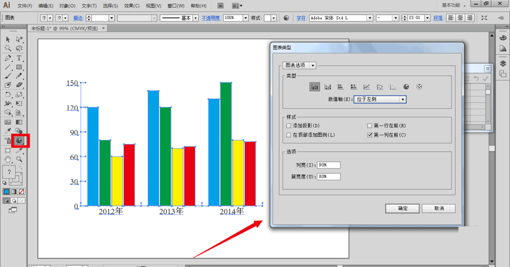 2、想直接把做好的柱形图表转换为其他类型的图表,首先,使用选择工具选择图表,双击“柱形图表工具”,接着会弹出一个“图表类型”设置面板