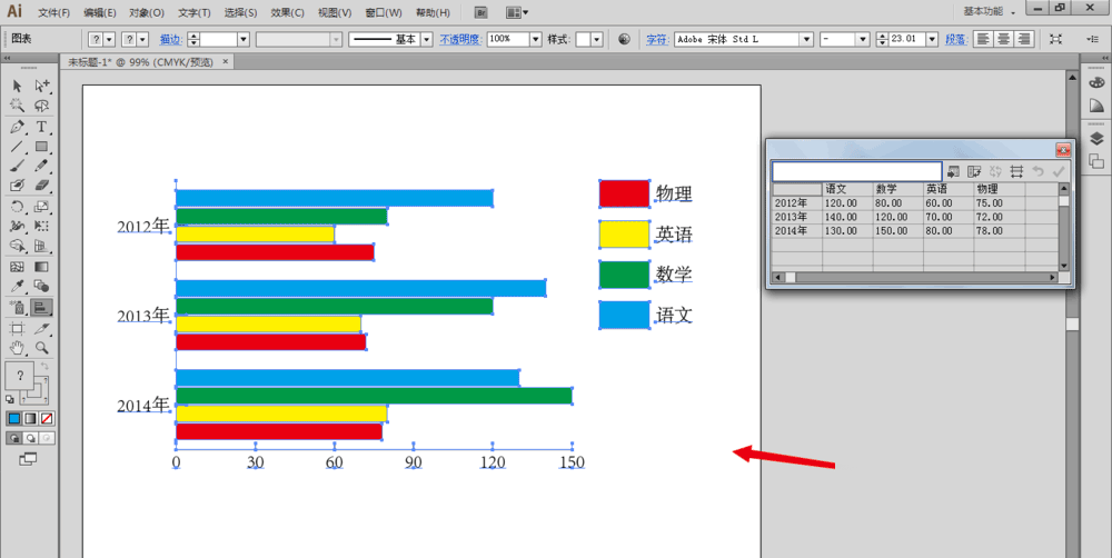 7、确定以后,画布上就可以看到一个漂亮的条形图表了。由此可见,在ai软件里面,制作好一个图表以后,想要其他类型的图表,都可以轻松转换。